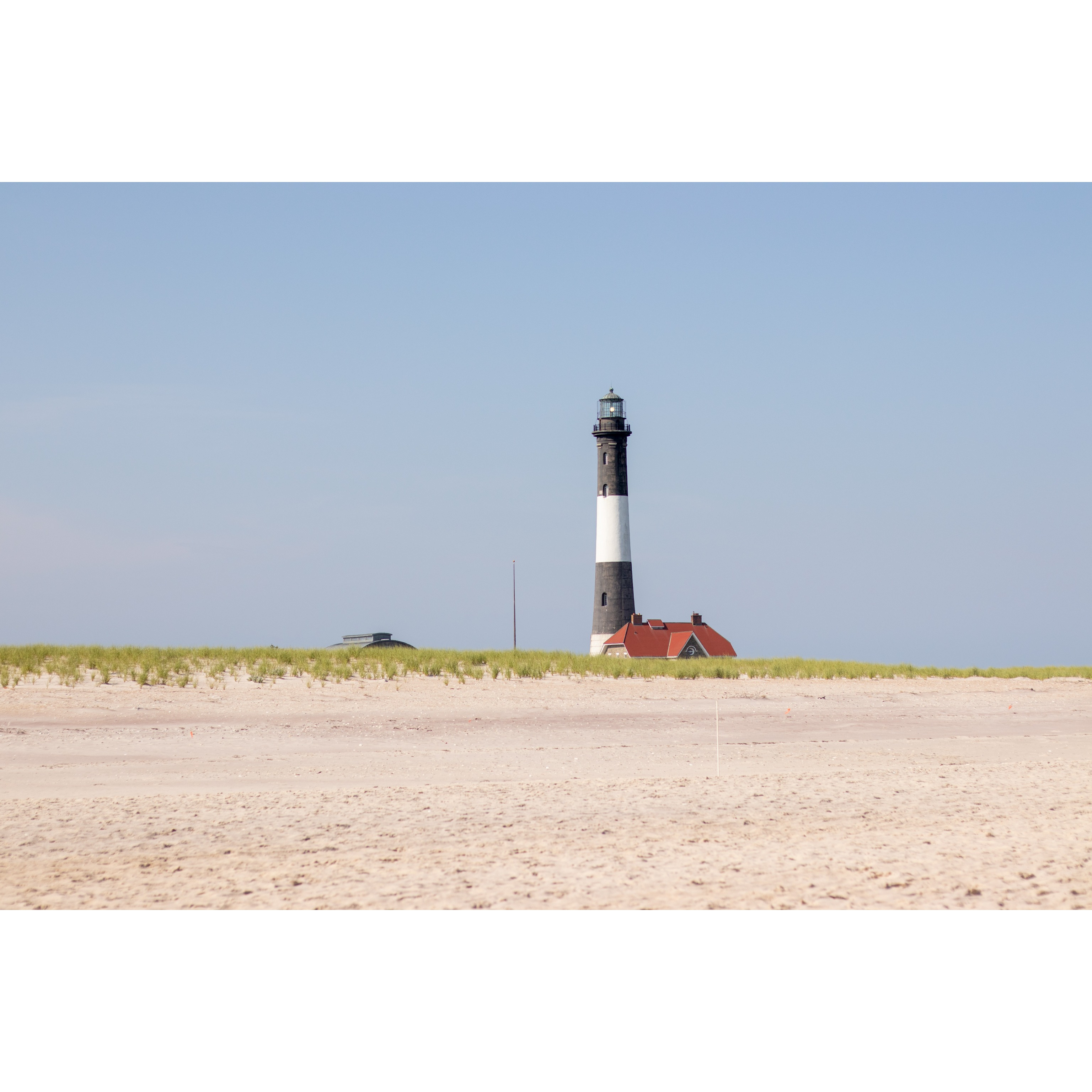 The Fire Island Lighthouse seen from the beach on a sunny summer day